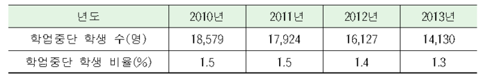 ▲ 서울특별시 초·중·고등학교 학업중단 학생 현황 (2010-2013) © 세계뉴스 |