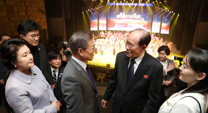 ▲ 문재인 대통령은 11일 북한 고위급대표단과 서울 남산 국립극장에서 열린 삼지연 관현악단의 두 번째 공연을 함께 관람했다. 삼지연 관현악단의 공연은 ‘반갑습니다’를 시작으로 약 100분간 펼쳐졌으며 K팝 그룹 소녀시대 멤버 서현이 깜짝 출연하기도 했다. 이날 문 대통령 내외는 김영남 위원장과 김여정 특사를 배웅으로 마지막까지 배려했다. © 세계뉴스 |