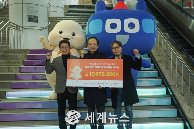 [세계뉴스 전승원 기자] 서울교통공사(이하 공사)와 365mc병원(대표이사 김남철)이 ‘아트건강기부계단’을 통해 모인 기부금 1,097만 원을 지난 27일 서울문화재단(대표이사 이창기)에 전달했다. 전달된 기부금은 장애 예술 무용 단체 지원에 사용될 예정이다.