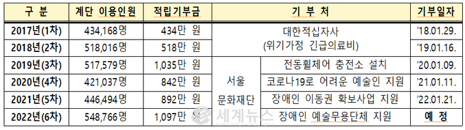 ▲ 지난 6년간 아트건강기부계단을 이용한 시민들 288만여 명의 적립기부금. 그동안 대표적인 사업으로는 위기가정 긴급의료비 지원, 전동 휠체어 충전소 설치, 장애인 이동권 확보사업 지원 등에 쓰였다. |