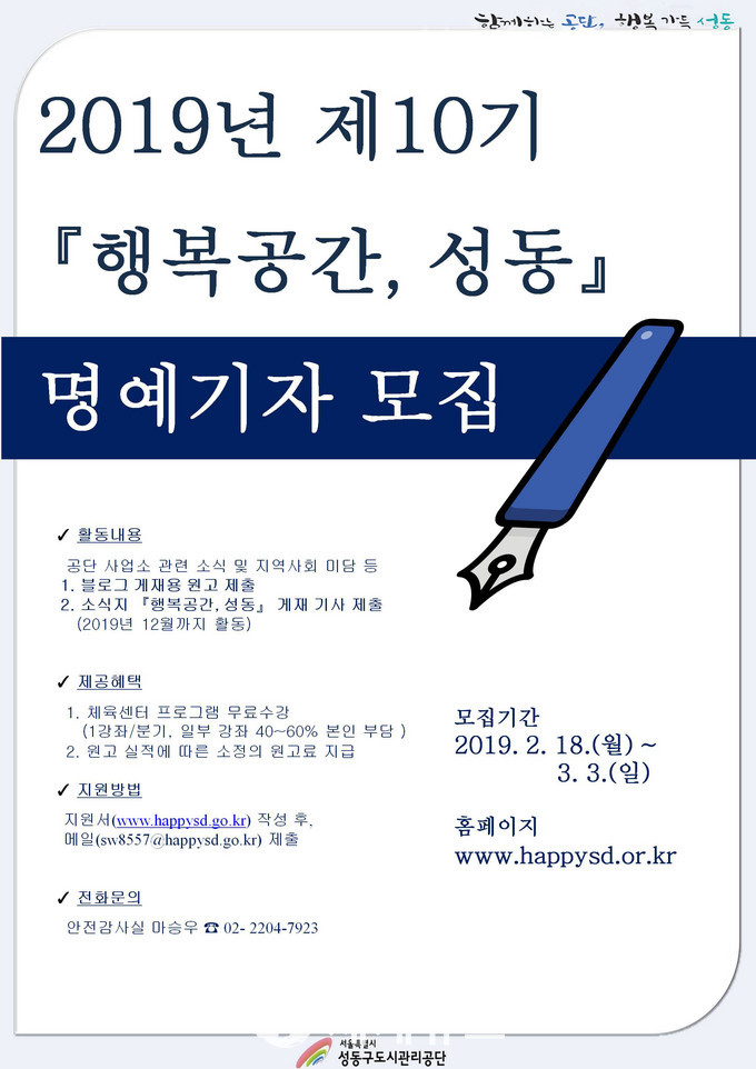 [세계뉴스] 조홍식 기자 = 성동구도시관리공단(이사장 김종수)이 오는 3월 3일까지 명예기자를 모집한다. 모집인원은 8명 내외로 활동기간은 12월까지다.