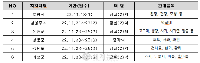 ▲ 2022년 판매 물품 및 장소・일정 일람. 지자체별 1~3일 운영하며, 판매물품은 현금 또는 카드로 결제할 수 있다. |