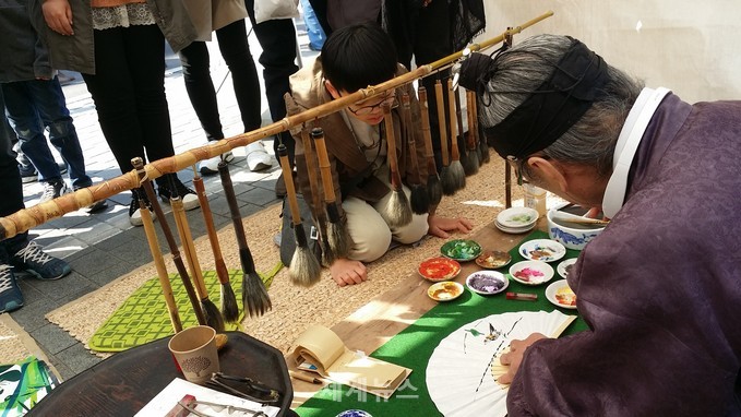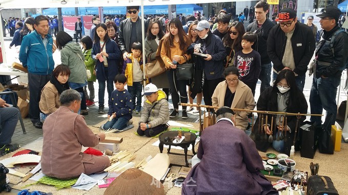 ▲ 2일 서울 세종대로에 나온 시민들이 '제19회 대나무축제' 담양군 홍보부스를 찾아 체험행사에 참가했다. 이날 많은 시민들은 김대석 선자장과 박인수 훈장의 부채만드는 것을 유심히 지켜보며 장인정신의 '얼'을 배웠다. © 세계뉴스 |