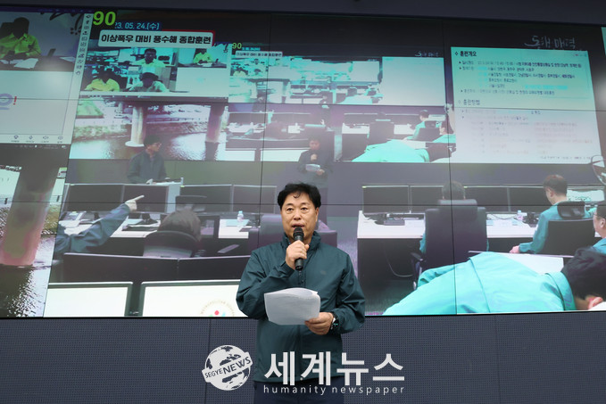 ▲ 24일 서울특별시의회 도시안전건설위원회 송도호 위원장이 서울시청 지하 3층 안전통합상황실에서 실시된 ‘이상폭우 대비 풍수해 종합 훈련’에 참석해 관계 공무원을 격려하고 여름철 풍수해에 대비해 철저한 예방과 점검을 당부했다. |