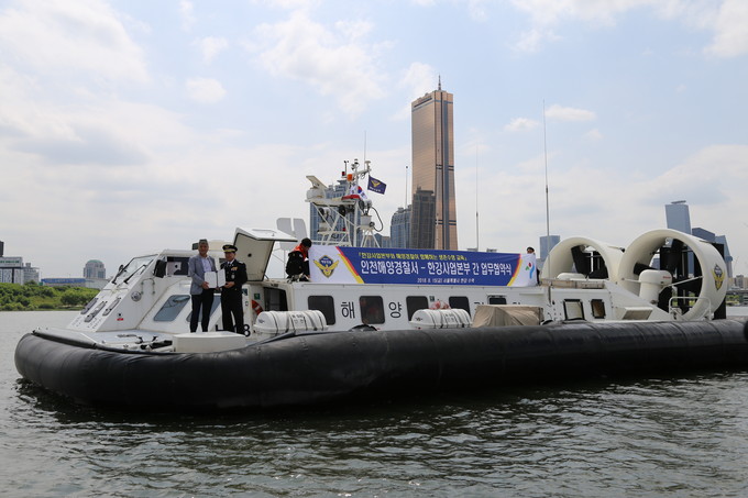 ▲ 한강사업본부 - 인천해양경찰서 간 업무협약 체결. 해양경찰 등 전문강사 10여명이 생존수영 체험교실을 수영장별로 상주하여 교육을 전담한다. |