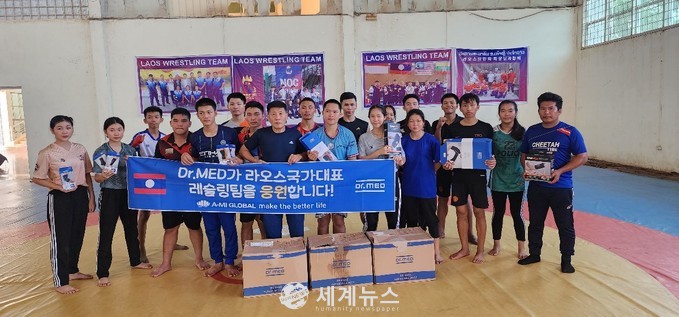 ▲ 한국의료기유통협회 회원사인 아미글로벌 유실근 회장과 한성메디 한광훈 대표가 라오스 레슬링 국가대표 김수길 감독 외 선수들을 지원하고 있다. |