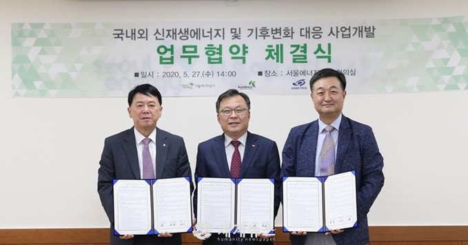 ▲ 김중식 서울에너지공사 사장(가운데)이 홍경표 ㈜건화 대표이사(좌), 정균 ㈜하나티이씨 대표이사와 국내외 신재생에너지 및 기후변화 대응 사업개발 업무협약 체결 후 기념촬영을 하고 있다. |
