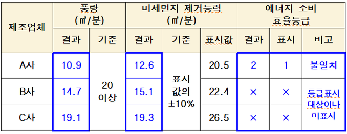 공기청정기의 풍량 성능 기준은 1분당 20㎥ 이상인데 A사 제품은 10.9㎥, B사 제품은 14.7㎥, C사 제품은 19.1㎥로 세 업체 모두 기준에 미치지 못했다고 감사위원회는 밝혔다.