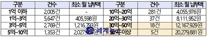 ▲ 그밖의 차입금 규모별 그밖의 차입금을 이용한 주택매입건수 (단위 : 원). 최소 월 납부액은 각 구간별 최소 대출금액을 은행에서 30년 만기, 연이율 2.70%, 원리금 균등분할상환을 조건으로 빌린 경우를 기준으로 계산하였으며, 50억 이상은 50억 원을 기준으로 계산. |