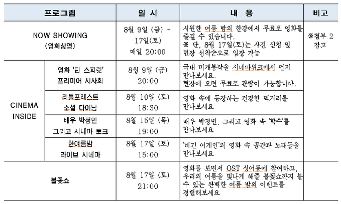 시네마위크는 한강몽땅 여름축제 일환으로 평일은 오후5시~10시, 주말은 오후3시~10시까지 열린다. ▴야외영화상영 ▴프리미어 시사회 ▴소셜다이닝 ▴시네마토크 ▴라이브시네마 등 영화를 주제로 한 다채로운 경험을 할 수 있는 이색 영화 축제다.