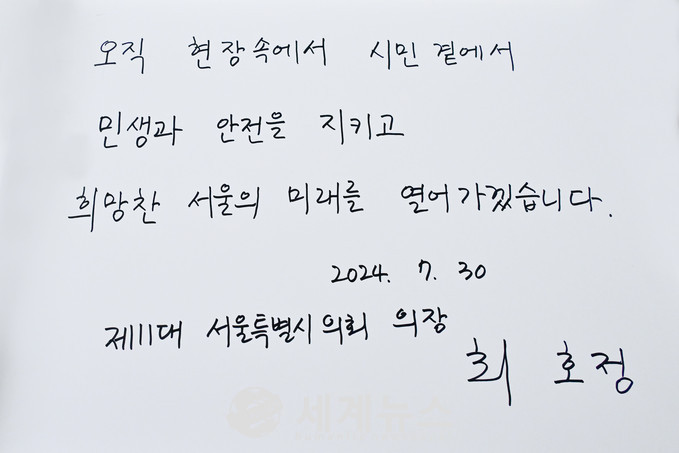 최 의장은 방명록에 “오직 현장 속에서 시민 곁에서 민생과 안전을 지키고 희망찬 서울의 미래를 열어가겠습니다”라고 적었다.