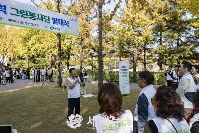 ▲ 30일 김경호 광징구청장이 '그린봉사단' 발대식에 참석해 축사를 하고 있다. 단원은 총 90명으로, 지역주민과 어린이대공원 직원, 공무원으로 구성됐다. |