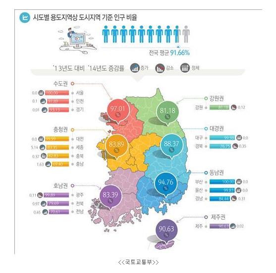 [서울=세계뉴스] 차성민 기자 = 우리나라 인구 10명 중 9명은 국토의 16% 가량인 도시지역에 몰려 사는 것으로 나타났다. 특히 도시지역 중 주거지역은 전체 국토의 2%를 조금 넘었다.