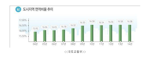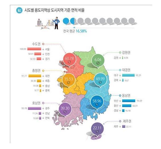 통계를 보면 '국토의 계획 및 이용에 관한 법률'에 따라 용도지역이 '도시지역'으로 분류된 면적은 1만7천596.8㎢로 용도지역상 국토(10만6천102.2㎢)의 16.58%였다.