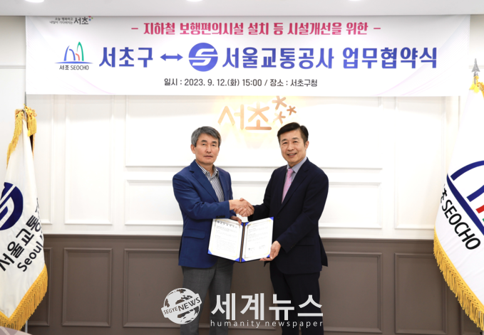 [세계뉴스 전승원 기자] 서울교통공사(사장 백호)는 지난 12일 서초구청과 지하철 승강 편의시설 설치 등 시설개선을 위한 업무협약을 체결했다.