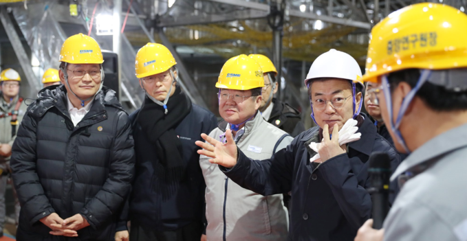 문재인 대통령은 3일 오전 경상남도 거제시에 있는 대우조선해양 옥포조선소를 방문해 쇄빙선 건조 현장의 노동자들을 만나 격려했다.