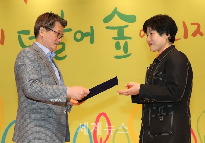▲ 19일 관악구청 8층 대강당에서 독서동아리 운영 워크숍을 개최한 가운데 유종필 구청장이 김성자(오른쪽)씨에게 독서홍보위촉장을 수여하고 있다. © 세계뉴스 |
