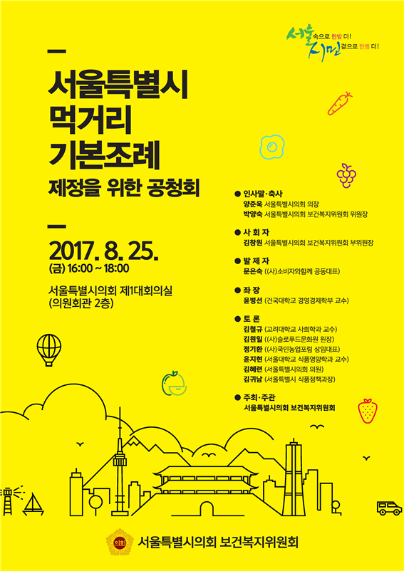 [세계뉴스] 전승원 기자 = 최근 달걀과 닭에 살충제가 검출되는 등 시민들의 먹거리에 대한 불안감과 불신이 높아진 가운데, 서울시의 지속가능한 먹거리체계 확립과 서울시민의 먹거리보장 실현을 목적으로 하는 ‘서울특별시 먹거리 기본조례’ 제정을 위한 공청회가 서울시의회 보건복지위원회의 주최로 25일 오후 4시 서울시의회 제1대회의실에서 개최될 예정이다.