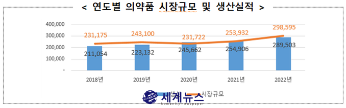 [세계뉴스 차성민 기자] 식품의약품안전처(처장 오유경)은 2022년 국내 의약품 생산실적이 28조 9,503억원으로 전년(25조 4,906억 원)대비 13.6% 증가하며 역대 최고치를 기록했다고 밝혔다.