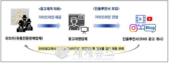 특히 피의자들은 개인 SNS에 제품 후기를 작성하는 것이 가능하다는 점을 이용해 인플루언서에게 '한 달에 7kg 감량', '초강력 식욕억제' 등의 광고 키워드를 제공했다. 인플루언서는 이를 활용해 체험 후기처럼 보이는 영상 등을 제작, 게시하여 불법 광고를 진행했다.