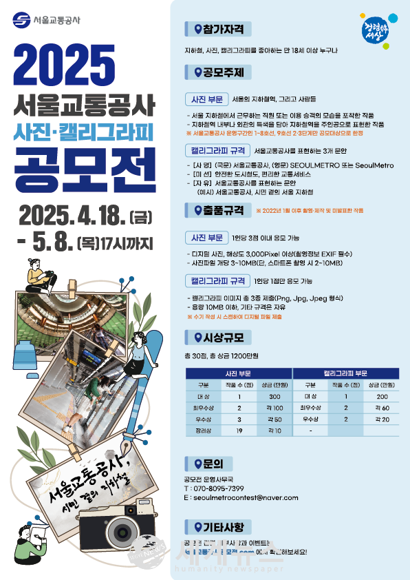 [세계뉴스 = 조홍식 기자] 서울교통공사가 시민을 대상으로 '2025 서울교통공사 사진·캘리그라피 공모전'을 개최한다고 밝혔다.