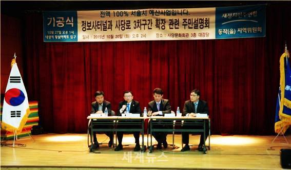 [서울=세계뉴스] 전승원 기자 = 새정치민주연합 동작을 지역위원회(허동준 위원장)와 서울시의회 교통위원회 박기열 위원장(새정치민주연합, 동작3)은 20일 오후2시부터 ‘정보사터널 공사 및 사당로 3차구간(구 범진여객~솔밭로 입구) 도로확장공사 주민설명회’를 개최하여 지역 현안 사업에 대한 설명과 함께 지역주민들의 다양한 의견을 청취했다.