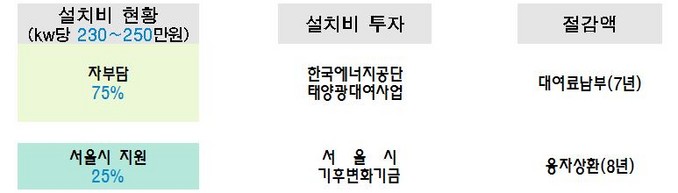 서울시가 설치비의 25%를 지원함에 따라 잔여 비용은 정부의 태양광 대여사업과 연계하거나 서울시 기후변화기금로부터 융자를 받게되면 초기 설치비용 부담없이 설치가 가능하다.