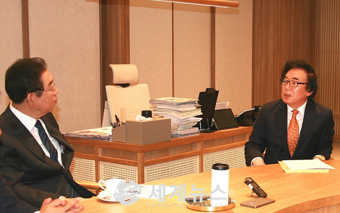 ▲ 2019년 4월 10일 상암복합쇼핑몰 인‧허가 추진관련, 시장실에서 故 박원순 서울시장과 김기덕(오른쪽) 서울시의원이 면담을 하고 있다. |