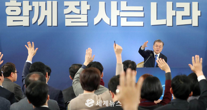 ▲ 10일 문재인대통령은 신년기자회견 질의응답시간에 기자들이 손을 들어보이고 있다. |