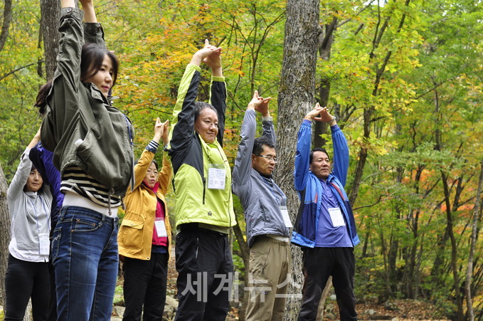 ▲ 지난해 10월 강원도 인제군 만해마을에서 진행된 힐링캠프에서 직원들이 유산소 운동을 하고 있는 모습 © 세계뉴스 |