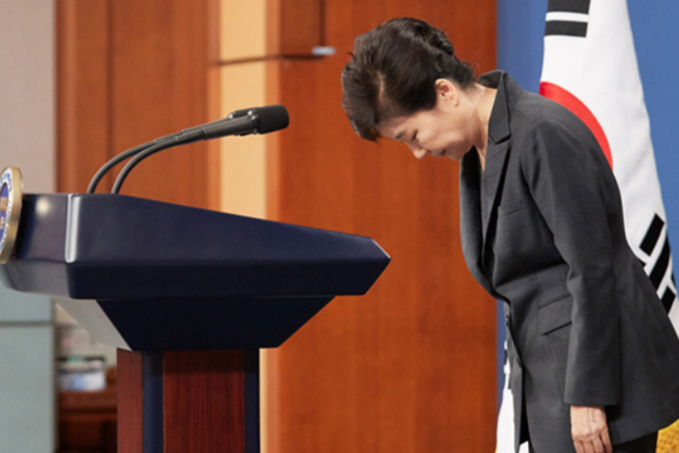 ▲ 박근혜 대통령은 29일 오후 2시 30분 청와대 춘추관 대브리핑실에서 제3차 대국민담화를 발표한후 고개숙여 사과를 하고 있다. © 세계뉴스 |