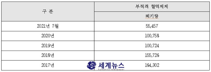 [세계뉴스 탁병훈 기자] 269억 원어치의 혈액이 최근 4년간 폐기됐다. 국회 보건복지위 소속 더불어민주당 강병원 의원(서울 은평을)에 따르면 최근 5년간 혈액백 불량은 △2017년 1,152개(142개 교환, 1,010개 변상), △2018년 863개(286개 교환, 577개 변상), △2019년 1,203개(260개 교환, 943개 변상), △2020년 2,130개(1,145개 교환, 985개 변상), △2021년 7월까지 1,573개(1,076개 교환, 497개 변상)에 이른다. 변상수량은 혈액백, 성분채혈키트 불량으로 정상출고가 불가능하거나 정량채혈이 안 된 건수를 말한다.