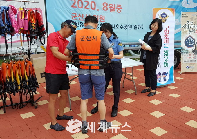 ▲ 군산해양경찰서는 연안안전의 날(7월 18일)을 맞아 연안안전에 대한 국민들의 관심과 안전의식을 고취시키기 위해 '구명조끼 입기 캠페인'을 진행하고 있다. |