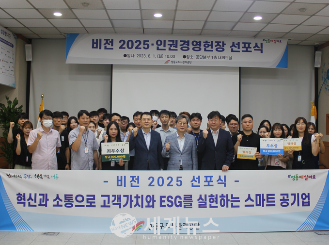 [세계뉴스 조홍식 기자] 서울 성동구(구청장 정원오) 산하 성동구도시관리공단(이하‘공단’)은 지난 1일 공단 본부 대회의실에서 임원, 노사협의회 근로자위원 및 직원이 참석한 가운데 “혁신과 소통으로 고객가치와 ESG를 실현하는 스마트 공기업”이라는 미래 비전[vision] 2025를 선포했다.
