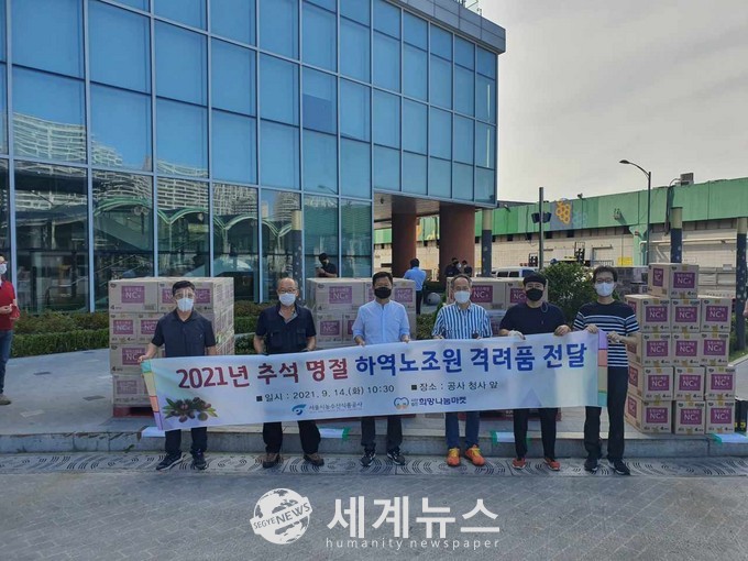 [세계뉴스 차성민 기자] 서울시농수산식품사(사장 김경호)이 추석 명절을 맞아 14일 가락시장 대표 공익법인 (사)희망나눔마켓을 통해 가락시장과 양곡시장 하역노조원들에게 격려품을 전달했다.