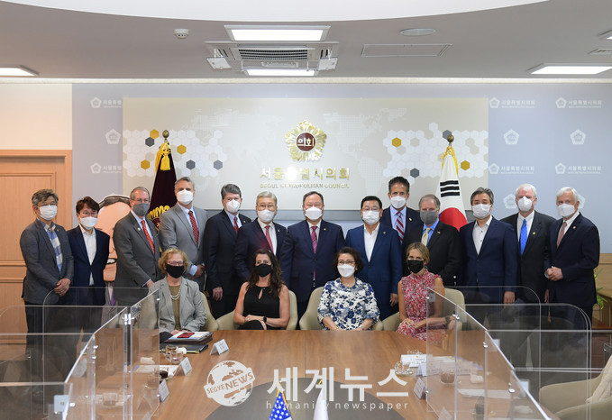 [세계뉴스 윤소라 기자] 서울특별시의회 김인호 의장은 29일 오후 2시 30분 의장 접견실에서 김창준 전 미국 연방하원의원을 비롯한 전직 미국 연방상·하원의원 방문단을 접견해 양국의 지방자치 역사를 돌아보고, 지방의회 상호 교류에 대해 논의했다.