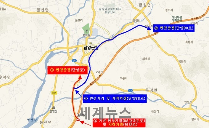 ▲ 광주대구고속도로(구.88올림픽고속도로) 2.7Km 구간에 대해 담양 관문의 의미를 살려 ‘담양로’로 정했고, 한국도로공사 자재창고 부근부터 금성면 대실마을 입구까지 6.7Km 구간에 대해 구88고속도로 옛 명칭을 살리고자 ‘담양88로’로 도로명을 부여했다. © 세계뉴스 |