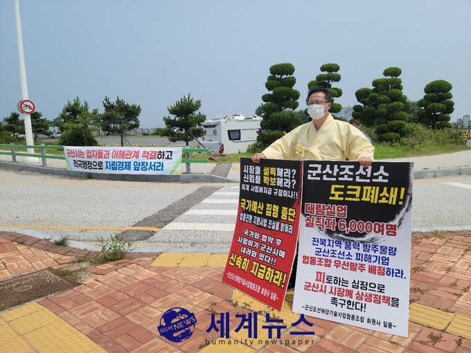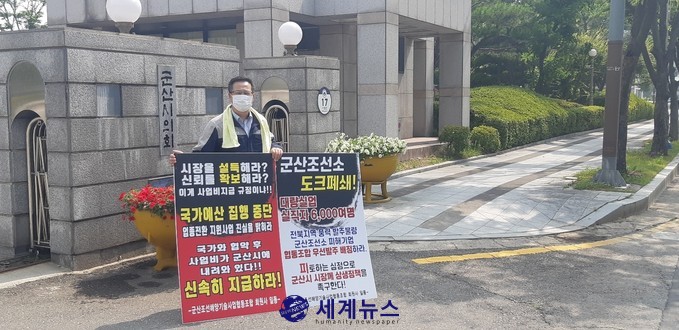 [세계뉴스 전승원 기자] 군산조선소기업 업종전환 사업이 좌초위기에 몰린 가운데 사업 수행자인 군산조선해양기술사업협동조합이 피켓시위를 이어가면서 군산시와 협동조합 간에 긴장감이 팽팽해지고 있다.
