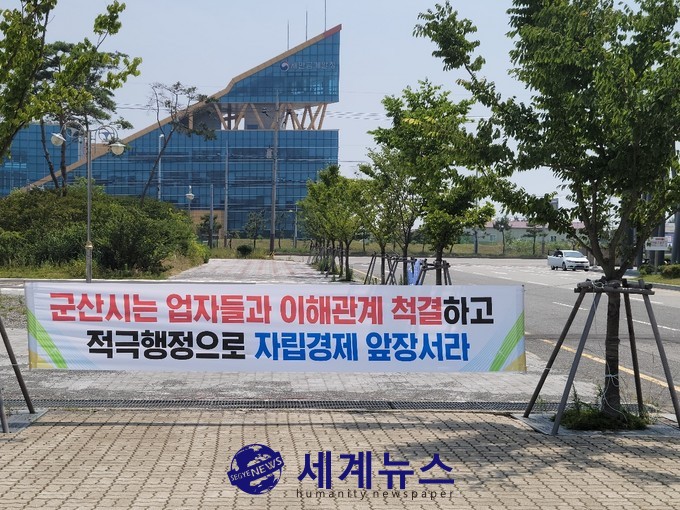 ▲ 군산새만금컨벤션센터 GSCO(지스코)에 “군산시는 업자들과 이해관계 척결하고 적극행정으로 자립경제 앞장서라”는 현수막이 내걸려 있다. (사진=윤준필 기자) |