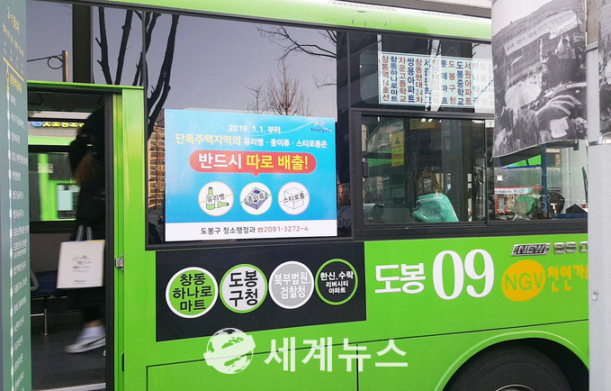 ▲ 도봉구는 재활용 분리배출 의식 확산을 위해 마을버스에 홍보판을 설치 운영하는 등 노력을 기울리고 있다. |