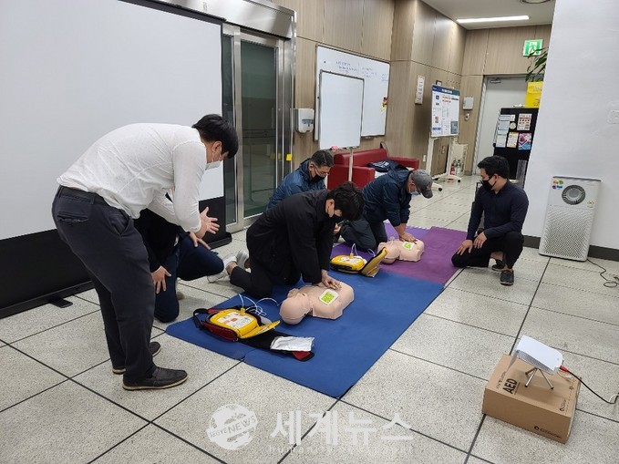 ▲ 심장 제세동기 사용법과 심폐소생술을 익히고 있는 모습. |