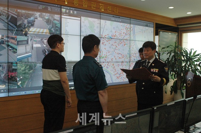 ▲ 25일 동대문구청 CCTV 통합관제센터에서 진행된 FTX 훈련유공 상장 수여식에서 정훈도 동대문경찰서장(오른쪽)이 관제센터 직원들에게 상장을 전달하고 있다. © 세계뉴스 |