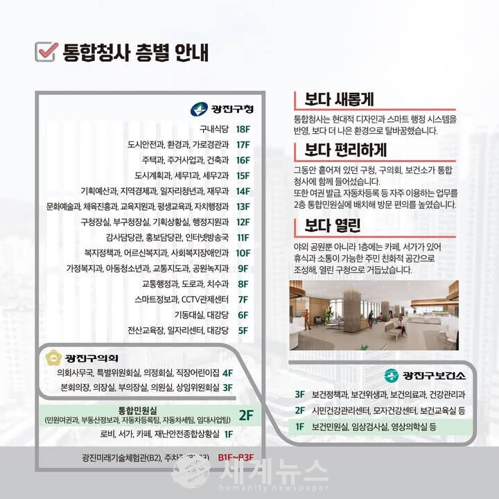 새 청사는 광진구 아차산로 400(자양2동)에 위치하며, 양 옆으로는 보건소와 광진구의회가 자리잡고 있어 업무 효율성을 높였다. 이는 주민 편의를 최우선으로 고려해 설계된 결과다.