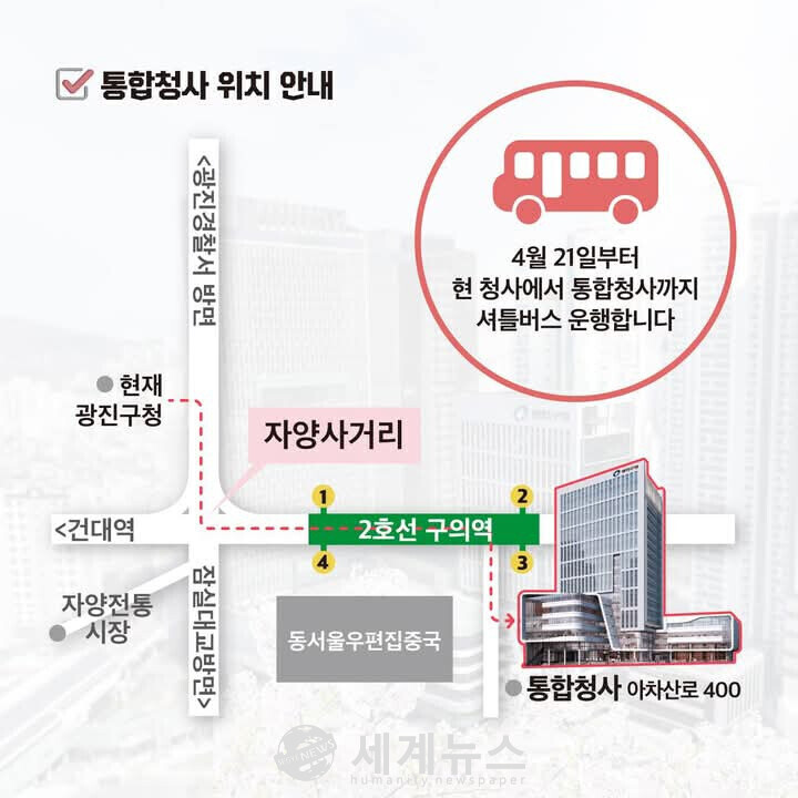 광진구는 오는 21일부터 기존 구청에서 구의역 3번 출구의 신청사까지 셔틀버스를 운행할 예정이다.