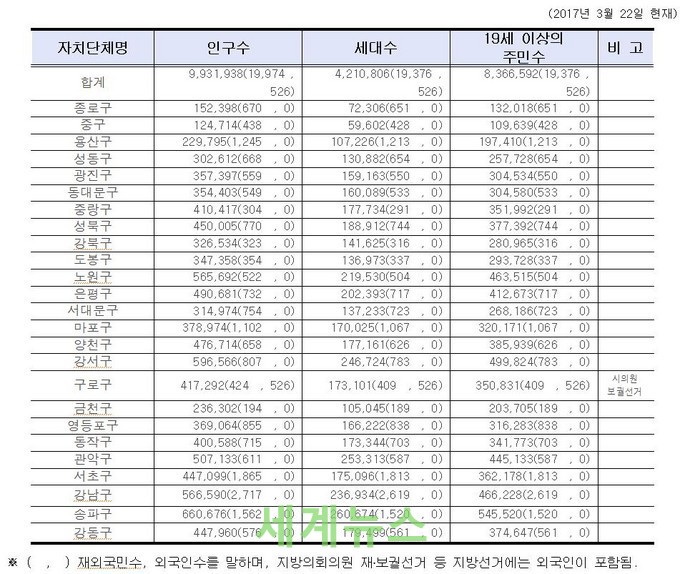 ▲ 서울특별시 인구수, 세대수, 19세 이상 주민수 등 현황 © 세계뉴스 |