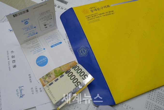 ▲ 동대문구의회 A씨가 기자에게 "잘 봐 달라"며 '돈봉투'를 자료와 함께 끼워 놓았다가 또 다시 적발됐다. © 세계뉴스 |
