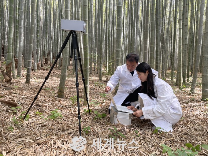 ▲ 대나무숲에서 음이온을 측정하고 있는 모습. 담양군청 제공 |