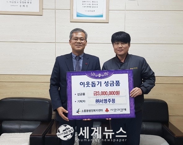 [세계뉴스 윤준필기자] 군산시 소룡동은 서영주정(주)(대표 김일우)에서 26일 관내 거주하는 어려운 이웃들을 위해 써달라며 현금 300만원을 기탁했다고 밝혔다.