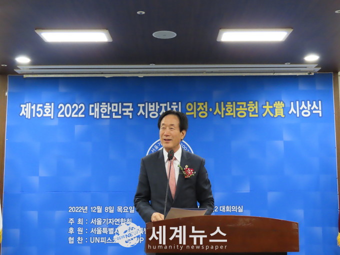 [세계뉴스 차성민 기자] 서울기자연합회(회장 정상린)는 8일 오후 3시 서울특별시의회 대회의실에서 ‘제15회 2022 대한민국 지방자치 의정·사회공헌 大賞’ 시상식을 개최했다.
