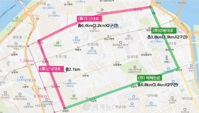 이날 김 의원은 강남권의 주요 간선도로인 테헤란로(삼성역-강남역)~강남대로(강남역-신사역)~도산대로(신사역-영동대교 남단)~영동대로(영동대교 남단-삼성역)에 총 10.6km를 연결하여 ‘격자 또는 우물 정자’ 형태의 ‘걷고 싶은 보도’를 조성해 주길 요청했다.